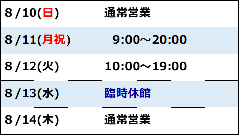 ※2025/8/11(月祝)・12(火)は短縮営業、13(水)は臨時休館となります。