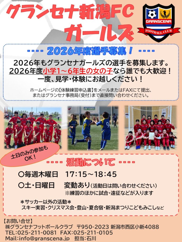 【選手募集♪】グランセナ新潟FC“ガールズ”